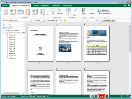 Puede cambiar el factor de ampliación de las páginas mostradas en la Ventana de trabajo.