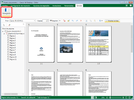 (Miniaturas): muestra las miniaturas de las páginas del documento. Al hacer clic en las miniaturas, puede seleccionar las páginas que va a mostrar o editar.