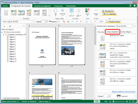 Pestaña [Config. Impresión]: muestra el contenido de los ajustes de impresión.
