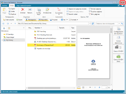 Desktop Browser se abre con la misma ventana que cuando se cerró por última vez. Sin embargo, cuando vuelva a abrir Desktop Browser, la Ventana de navegación se inicia mostrando la pestaña [Bibliotecas] aunque antes del reinicio mostrase la pestaña [Condiciones de búsqueda].