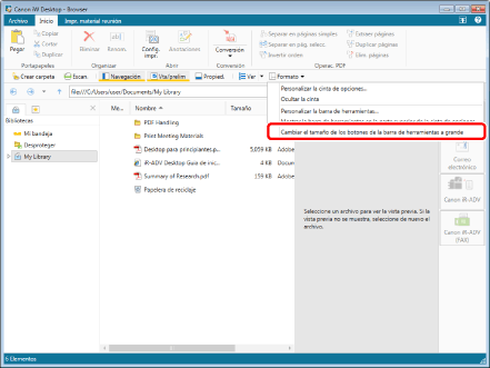 Esta sección describe cómo cambiar los botones mostrados en la barra de herramientas a botones de tamaño grande.