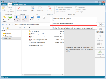 Haga clic con el botón derecho del ratón en la cinta o la barra de herramientas y seleccione [Personalizar la barra de herramientas].