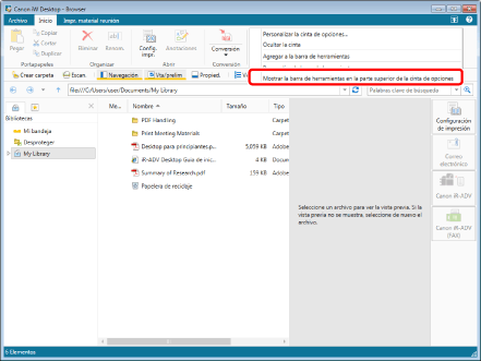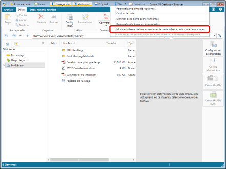 Puede cambiar la posición de visualización de las barras de herramientas. Estas pueden mostrarse encima o debajo de la cinta.