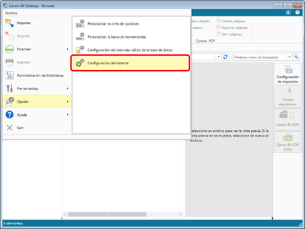 Seleccione el menú [Archivo] > [Opción] > [Configuración del sistema].