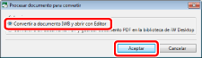 Si se ha seleccionado [Convertir a un documento PDF y guardar documento PDF en la biblioteca de iW Desktop] en [Configuración del sistema], el documento se guarda en Desktop Browser sin importarse en Desktop Editor. Para obtener más información, consulte: