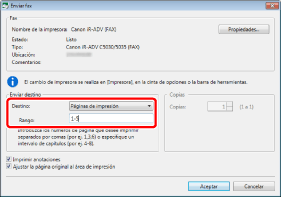Aparece el cuadro de diálogo [Enviar fax] si se selecciona la casilla de verificación [Mostrar diálogo de impresión/envío de fax]. En ese caso, vaya al paso 4.