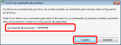 Aparecerá el cuadro de diálogo [Confirmar contraseña de permisos] cuando se selecciona la casilla de verificación [Restringir edición e impresión del documento].