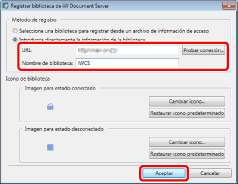 Introduzca la URL de la biblioteca en [URL] y el nombre de la biblioteca en [Nombre de biblioteca]; a continuación haga clic en [Aceptar].