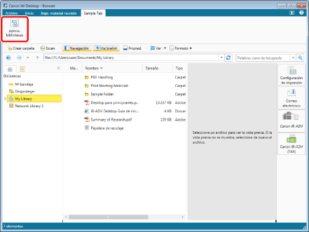 Cuando se registra una Biblioteca de red (base de datos), la base de datos para gestionar documentos se guarda en la carpeta de instalación Desktop. Asegúrese de que la carpeta de instalación de Desktop tiene suficiente espacio libre porque los archivos podrían no poderse guardar en la base de datos y los resultados de búsqueda no se mostrarían adecuadamente si no hay suficiente espacio libre.