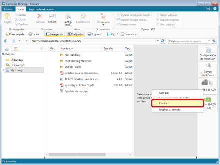 (botón de salida de la impresora) para eliminar y seleccione [Eliminar].