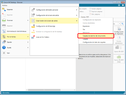 También puede crear una Carpeta de destino del documento desde Desktop Editor. Para crear una Carpeta de destino del documento desde Desktop Editor, seleccione el menú [Archivo] > [Configuración/Administración] > [Crear carpeta de destino del documento].