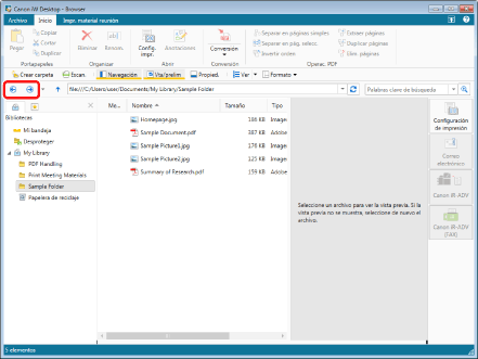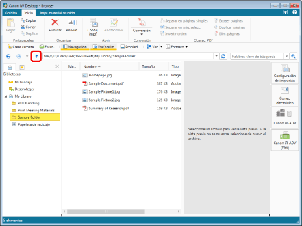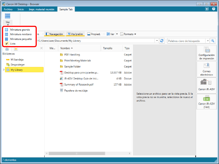 Las carpetas y documentos guardados en la biblioteca o carpeta seleccionadas se muestran en la Ventana de visualización de la lista de archivos.