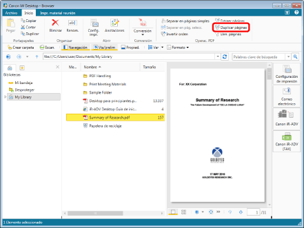 Si seleccionó varias páginas con la vista miniatura, el documento PDF duplicado se guarda añadiendo el "_número de página de la primera página seleccionada" en el nombre del documento.