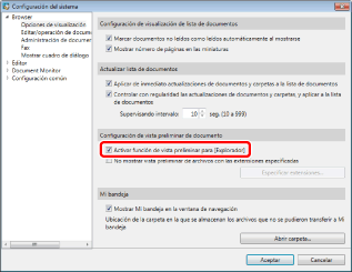 La función de vista preliminar de Desktop Browser y la función de vista preliminar de Windows Explorer son iguales. La configuración de Desktop Browser para activar la vista preliminar de los documentos de Office no está relacionada con el ajuste [Mostrar controladores de vista previa en el panel de vista previa] en las opciones de carpeta de Windows Explorer. La activación de la vista preliminar se realiza por separado por cada tipo de archivo y, aunque no es común, es posible que algunos tipos de archivos no puedan verse. En este caso, confirme si puede ver el tipo de archivo en Windows Explorer.
