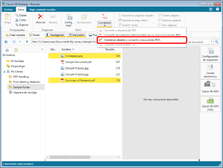 (Conversión) en la cinta y seleccione [Establecer detalles y convertir a documento PDF].