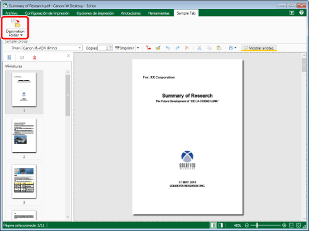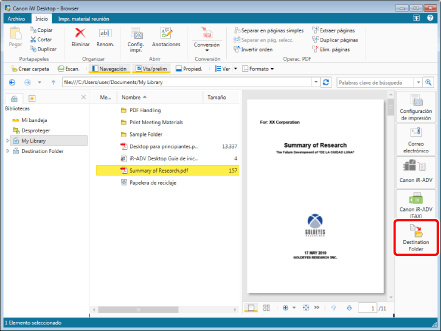 para una Carpeta de destino del documento mostrada en la barra de herramientas