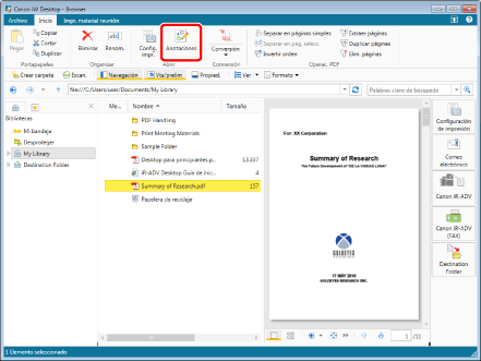Si realiza una de las siguientes operaciones sin seleccionar un documento, la Carpeta de destino del documento se selecciona en la Ventana de navegación, y puede consultar las carpetas y documentos en la Carpeta de destino del documento en la Ventana de visualización de la lista de archivos.
