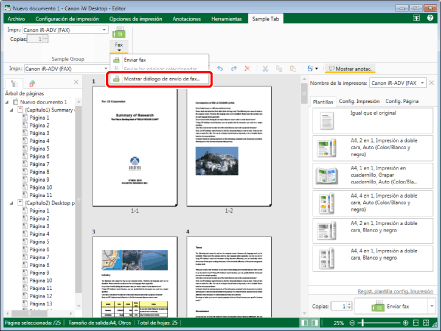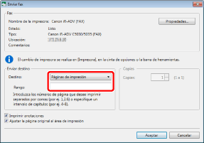 Aparecerá el cuadro de diálogo [Enviar fax] si se selecciona la casilla de verificación [Mostrar diálogo de impresión/envío de fax]. Para obtener más información sobre cómo utilizar el cuadro de diálogo [Enviar fax] para enviar documentos por fax, consulte:
