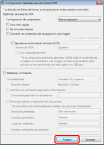 Configure los ajustes avanzados del documento PDF; haga clic en [Aceptar].