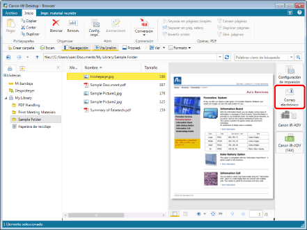 Seleccione el documento a enviar como adjunto de un correo electrónico en la Ventana de visualización de la lista de archivos.
