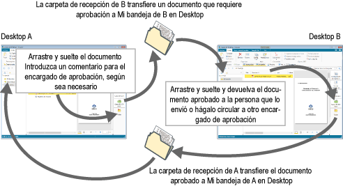 Los documentos se envían y reciben utilizando Mi bandeja en [Bibliotecas] en la Ventana de navegación y los botones de salida de bandeja de destino registrados en la barra de salida de la pantalla [Desktop Browser]. El documento que se arrastra y se suelta en el botón de salida de bandeja de destino se transfiere a Mi bandeja del destinatario. Puede editar y hacer circular los documentos recibidos en Mi bandeja.