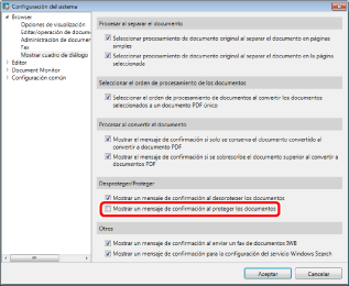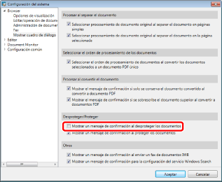 [Configuración del sistema] > [Browser] > [Mostrar cuadro de diálogo] > [Mostrar un mensaje de confirmación al proteger los documentos]