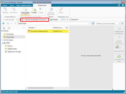 Cuando cancela la desprotección en la carpeta de desprotección, cancele el estado de desprotección de la Biblioteca de Document Server, y después elimine el documento. Cuando cancela la desprotección mientras el documento está abierto, se realiza la cancelación de la desprotección, pero falla la eliminación del documento. Debe cerrar el documento antes de eliminarlo. Elimine el documento manualmente después de cerrarlo.