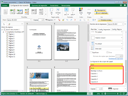 Esta función solo se puede utilizar si selecciona una impresora Canon y la casilla [Usar config. impr. de Editor] en la pestaña [Config. Impresión] de la Ventana Detalles, el comando de la cinta o el botón de herramienta.