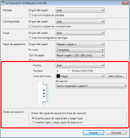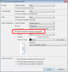 Seleccione un origen del papel que no sea la unidad de inserción. Cuando se alimenta papel desde la unidad de inserción, los nombres de capítulo no pueden imprimirse en los separadores de índice.