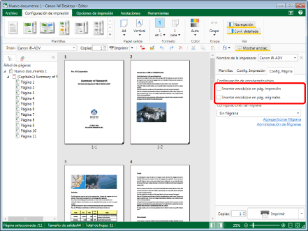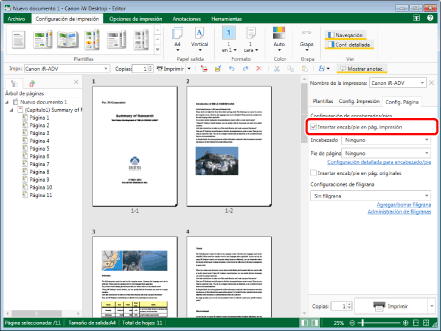 Seleccione la casilla [Insertar encab/pie en pág. originales] para establecer el encabezado/pie de página para la página original. Para usar un comando de cinta para ello, seleccione la casilla [Insertar encab/pie] en el grupo [Pág. originales] de la cinta.