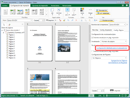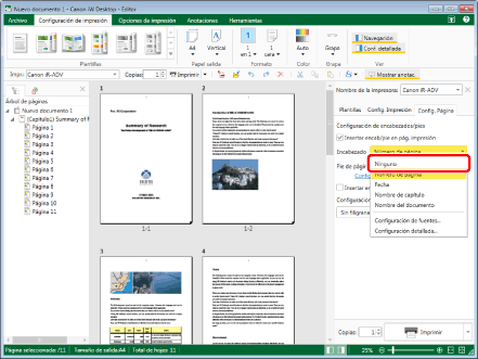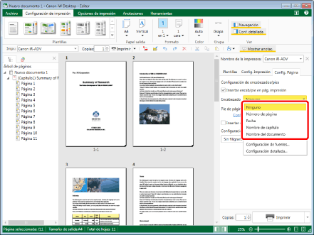 Seleccione [Configuración de fuentes] de la lista desplegable de cada [Encabezado]/[Pie de página] en [Configuración de encabezados/pies] en la pestaña [Config. Página] de la Ventana Detalles