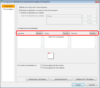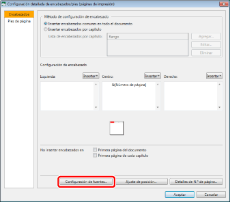 Las opciones de fuente tanto en [Insertar encab/pie en pág. impresión] como en [Insertar encab/pie en pág. originales] son iguales.