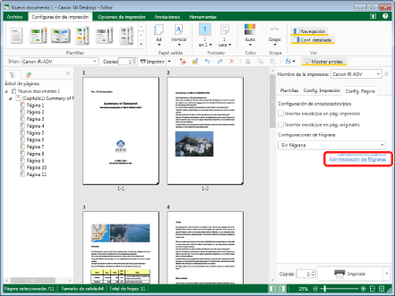 El cuadro de diálogo [Administración de filigranas] aparece al hacer clic en [Administración de filigranas] en la pestaña [Config. Página] de la Ventana Detalles.