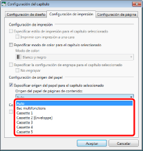 Los elementos de configuración en [Origen del papel de páginas de contenido] varían en función del origen del papel de la impresora seleccionada en [Impr.].