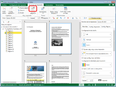 También puede hacer clic con el botón derecho en la página para cambiar los ajustes en la pestaña [Árbol de páginas] de la Ventana de navegación y seleccionar [Borrar configuraciones] en [Origen del papel para páginas originales].