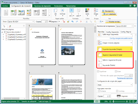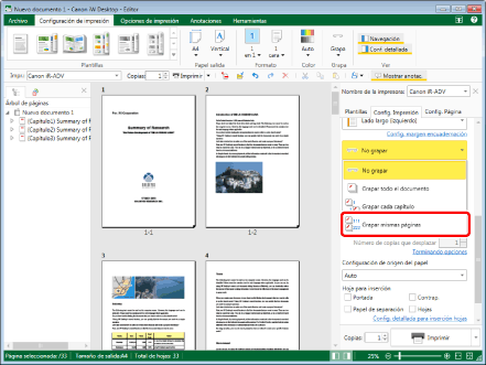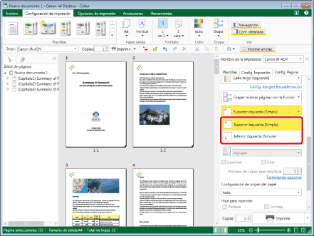 Esta función solo se puede utilizar si selecciona una impresora Canon y la casilla [Usar config. impr. de Editor] en la pestaña [Config. Impresión] de la Ventana Detalles, el comando de la cinta o el botón de herramienta.