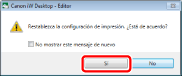 Seleccione el menú [Archivo] > [Opción] > [Configuración del sistema] > [Editor] > [Opciones] > [Mostrar mensaje de confirmación al restablecer la configuración de impresión].