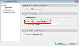 [Configuración del sistema] > [Editor] > [Anotaciones] > [Nombre de usuario]