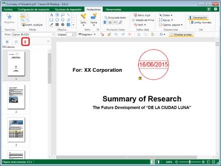 Si selecciona un sello digital de una página que no sea la que está seleccionada actualmente, la Ventana de trabajo cambia a la página en la que se encuentra el sello digital.