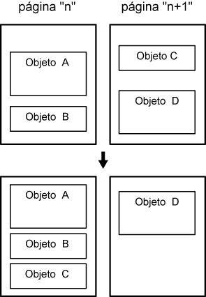Cuando se ejecuta la función de reducción de márgenes, estos se reducen y los objetos se desplazan hacia arriba en cada página. Además, si aparece un espacio en la parte inferior de una página, los objetos de la página siguiente se desplazan para ocupar ese espacio.