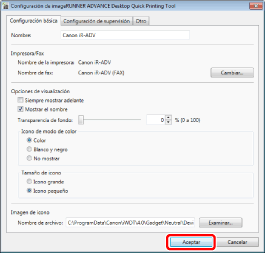 Cambie los ajustes según sea necesario y haga clic en el cuadro de diálogo [Configuración de imageRUNNER ADVANCE Desktop Quick Printing Tool] y en [Aceptar].