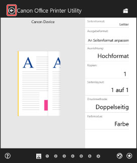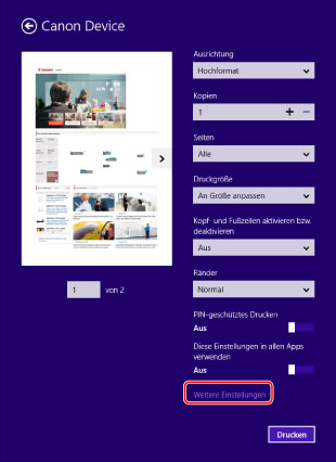 Falls die Funktionen, die Sie nutzen möchten, nicht auf dem Druckeinstellungsbildschirm einer Store-App angezeigt werden, können Sie diese möglicherweise erst nutzen, wenn Sie die Standardeinstellungen ändern. Sie können die Standardeinstellungen konfigurieren, wenn Sie den Druckeinstellungsbildschirm über das Gerätesymbol in [Geräte und Drucker] aufrufen.