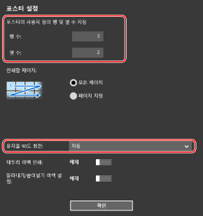 [포스터 설정] 화면 > [용지를 90도 회전] > [설정] 또는 [자동]을 선택한 경우