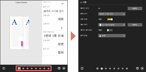 사용하려는 기능이 스토어 앱에 표시된 인쇄 설정 화면에 표시되지 않는 경우 기본 설정을 변경하면 사용할 수 있습니다. [장치 및 프린터]의 디바이스 아이콘에서 인쇄 설정 화면을 표시하여 기본 설정을 구성할 수 있습니다.