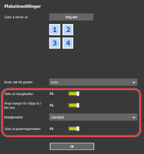 Når [Plakatinnstillinger]-skjerm > [Roter ark 90 grader] > [Av] er valgt