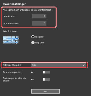 Når [Plakatinnstillinger]-skjerm > [Roter ark 90 grader] > [På] eller [Auto] er valgt