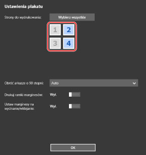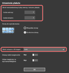 Jeżeli wybrano ekran [Ustawienia plakatu] > [Obróć arkusze o 90 stopni] > [Wł.] lub [Auto]