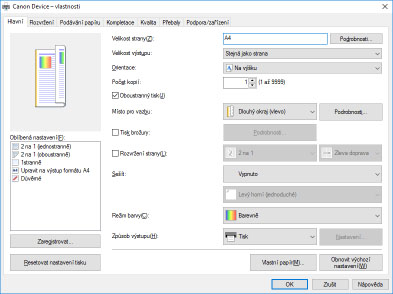 Při tisku z desktopové aplikací se zobrazí následující obrazovka nastavení tisku.