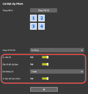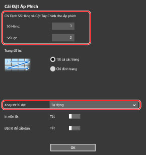 Khi [Cài Đặt Áp Phích] màn hình > [Xoay tờ 90 độ] > [Bật] hoặc [Tự động] được chọn