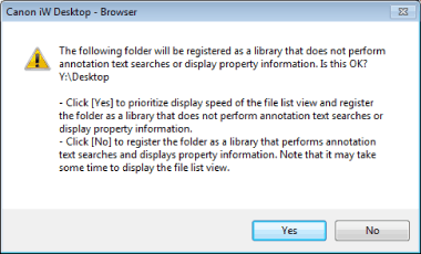 For a library on an Advanced Space, it may take a while to process the annotation information of the PDF document. If you click [Yes], the settings are changed so that searching or displaying of annotations will not be performed on the confirmation screen that is displayed when you register a library, and you can avoid this problem.